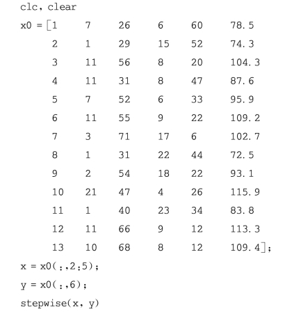 在MATLAB统计工具箱中用作逐步回归的是命令stepwise,它提供了一个交互式画面,通过这个工具你可以自由地选择变量,进行统计分析,其通常用法是: