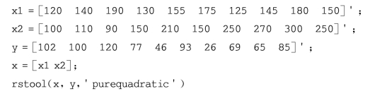 (2)多元二项式回归,统计工具箱提供了一个作多元二项式回归的命令rstool,它也产生一个交互式画面,并输出有关信息,用法是