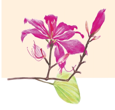 红花羊蹄甲又称紫荆花、红花紫荆、洋紫荆、玲甲花、乌桑树。为常绿乔木,分枝多。叶革质,基部心形,裂片顶钝。总状花序顶生或腋生。花蕾纺锤形;花萼佛焰状;花瓣红紫色,具短柄,倒披针形。