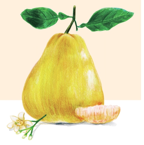 柚子树为高大乔木。叶质厚,色浓绿,阔卵形。总状花序,有时兼有腋生单花;花蕾淡紫红色,稀乳白色。果圆球形、扁圆形、梨形或阔圆锥状,淡黄或黄绿色,果皮甚厚或薄,海绵质,瓢囊10—15或多至19瓣,种子形状不规则,通常近似长方形。花期4—5月,果期9—12月。