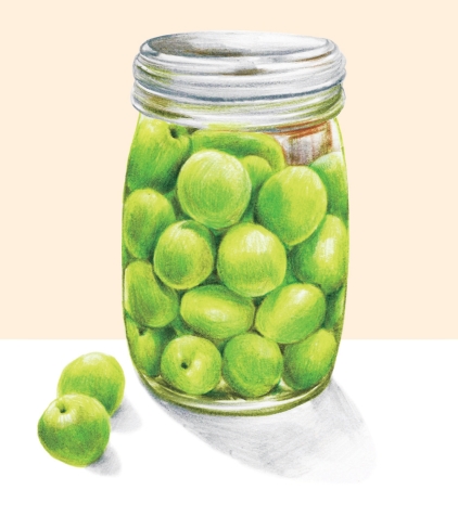 青梅又名青皮、海梅、油楠、青相。为高大乔木,小枝被星状绒毛。叶片革质,长圆形。圆锥花序顶生或腋生,被银灰色的星状毛。花瓣5枚,白色,有时为淡黄色。果实球形,增大的花萼裂片其中2枚较长,先端圆形。花期5—6月,果期8—9月。