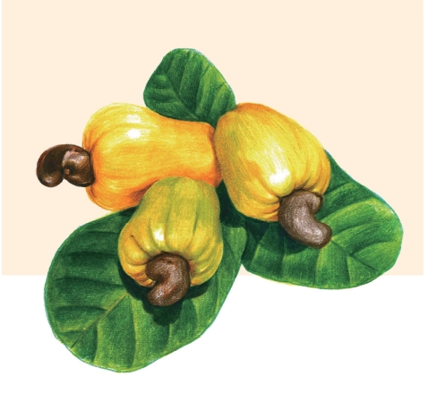 腰果又名鸡腰果、如树、介寿果。为灌木或小乔木。叶革质,倒卵形,全缘,两面无毛。圆锥花序宽大,多分枝,排成伞房状,多花密集;花黄色,杂性,花瓣线状披针形,开花时外卷。核果肾形,两侧压扁,果基部为肉质梨形或陀螺形的假果所托,成熟时紫红色;种子肾形。