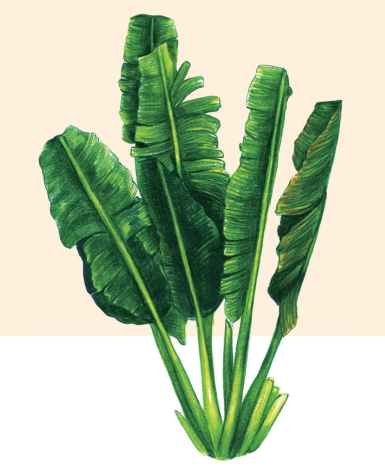 芭蕉又称板蕉、牙蕉、大叶芭蕉、芭蕉头。为多年生草本植物。叶片长圆形,先端钝,基部圆形或不对称,叶面鲜绿色,有光泽,叶柄粗壮。花序顶生,下垂;苞片红紫色;雄花生于花序上部,雌花生于花序下部。浆果三棱状,长圆形,近无柄,肉质。种子黑色,具疣突及不规则棱角。