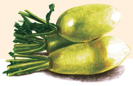 萝卜又名莱菔。为二年或一年生草本植物。直根肉质,长圆形、球形或圆锥形,外皮绿色、白色或红色。基生叶和下部茎生叶大头羽状半裂,上部叶长圆形,有锯齿或近全缘。总状花序顶生及腋生,花白色或粉红色,花瓣倒卵形,具紫纹。长角果圆柱形,种子卵形,微扁,红棕色,有细网纹。