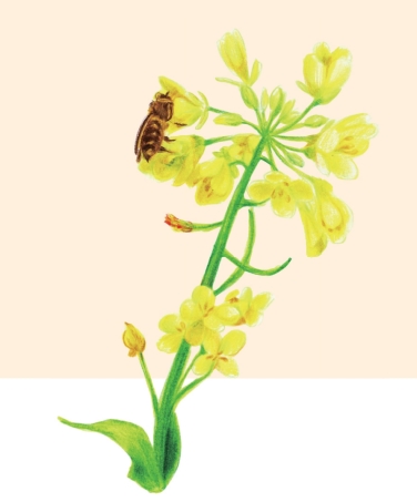 油菜又名芸薹。二年生草本植物。茎粗壮,直立,分枝或不分枝,稍带粉霜。叶长卵形,羽裂,边缘具不整齐弯缺牙齿或缘毛;叶柄宽,基部抱茎。总状花序在花期成伞房状,以后伸长;花鲜黄色,萼片长圆形,直立开展;花瓣倒卵形,顶端近微缺。长角果线形。种子球形,紫褐色。花期3—4月,果期5月。