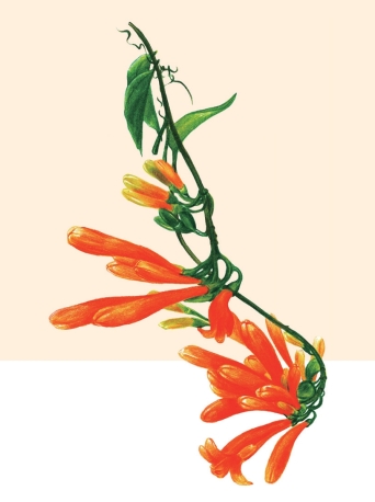 炮仗花为多年生常绿藤本植物,具有3叉丝状卷须,纤细的茎枝呈绿色,具分枝,分枝在节处轮生。叶对生,卵形。圆锥花序着生于侧枝的顶端,花萼钟状,花冠筒状,橙红色,花蕾呈镊合状排列,花柱与花丝均伸出花冠筒外。果瓣革质,舟状,内有种子多列,种子具翅,薄膜质。花期通常在1—6月。