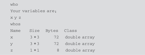 who和whos这两个命令用于显示在MATLAB工作空间中驻留的变量名清单.但whos在给出驻留变量名的同时,还给出它们的维数、所占字节数及变量的类型.下面的例子说明了who和whos命令的区别.