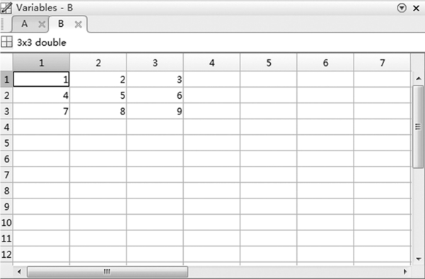 MATLAB工作空间窗口专门用于内存变量的管理.在工作空间窗口中可以显示所在内存变量的属性.当选中某些变量后,再单击工作空间窗口工具栏中的“Delete”按钮,就能删除这些变量.当选中某些变量后,再单击“Open Selection”按钮,即进入变量编辑器(图2-3),通过变量编辑器可以直接观察变量中的具体元素,也可修改变量中的具体元素.