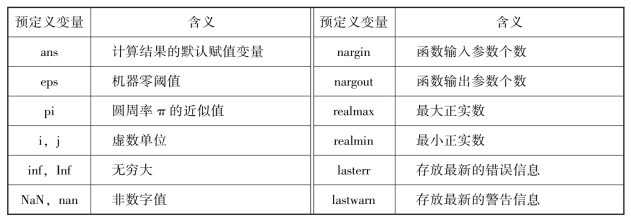 在MATLAB工作空间中,还驻留几个由系统本身定义的变量.除前面介绍过的ans、pi和i外,还有一些常用的预定义变量,现将它们列于表2-2中.