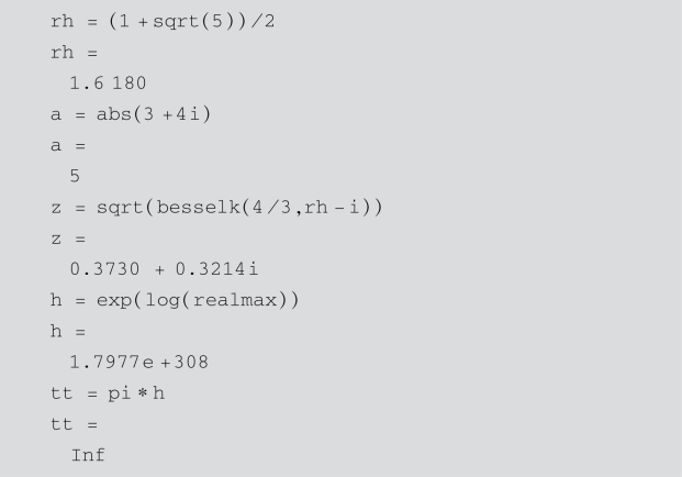 MATLAB提供了很多内部数学函数,包括abs、sqrt、exp和sin等.对负数取平方根或对数不会导致错误,MATLAB会自动返回复数计算结果.MATLAB还提供了很多高级的数学函数,包括Bessel和gamma函数等.这些函数中的大部分都接受复数变量.在命令窗口键入下面的命令,可以查看此类函数的列表.