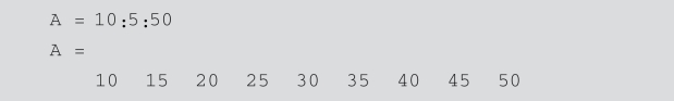 实际上,使用冒号操作符时,可以指定增量步长值.可以使用(first:step:last)的格式.例如下面创建一个10和50之间增量为5的数值序列.