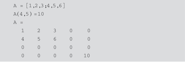 这时将只改变该元素的值,而不影响其他元素的值.如果给出的行下标或列下标大于原来矩阵的行数或列数,则MATLAB将自动扩展原来的矩阵,并将扩展后未赋值的矩阵元素置为0.例如: