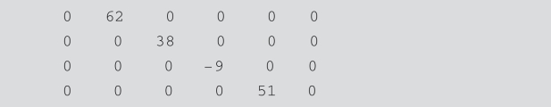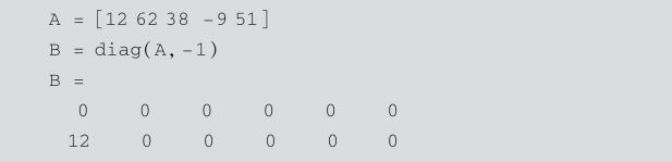 下面的代码根据向量创建一个对角矩阵.可以将向量元素放在矩阵的主对角线上,或者放在主对角线的上方或下方,如下所示,其中-1表示将向量元素放在主对角线下方.