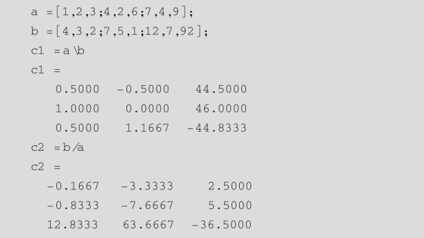 对于含有标量的运算,两种除法运算的结果相同,如3/4和4\3有相同的值,都等于0.75.又如,设a=[10.5,25],则a/5=5\a=[2.1000 5.000].对于矩阵来说,左除和右除表示两种不同的除数矩阵和被除数矩阵的关系.对于矩阵运算,一般A\B≠A/B.例如: