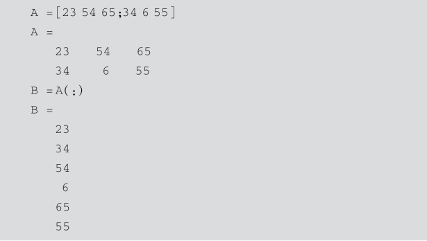 在这里,A(:)产生一个6×1的矩阵,等价于reshape(A,6,1).