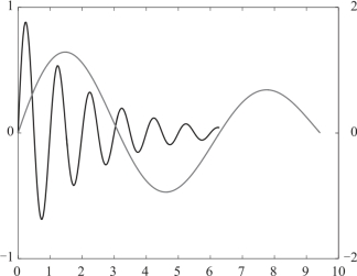例3.6 用不同标度在同一坐标内绘制曲线y=e-0.5xsin(2πx)和y=1.5e-0.1xsin x.