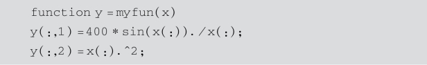 其中,filename是函数名,以字符串形式出现,或是函数文件名,自变量为x,如sin(x),[sin(x),cos(x)];lims是x和y的取值范围,行向量形式;[xmin,xmax]表示x的取值范围;[xmin,xmax,ymin,ymax]表示x和y的取值范围;tol表示相对允许误差,系统默认值为2×10-3;LineSpec选项与plot函数相同.