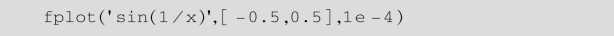 fplot函数是自适应采样绘图函数.前面讲的绘图函数在绘制曲线图时,取数据点一般采用等间隔采样,这对振荡较为强烈的函数就不适应了,即使数据点足够稠密.fplot函数有自适应采样的功能,在变化率大的区域密集采样,能更好地反映函数的变化规律.该函数的调用格式为: