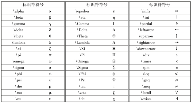 例如,text(2,3.5,sin({\omega}t+{\alpha}))就会在图形坐标(2,3.5)处标注sin(ωt+α).还可以用LaTex中\bf、\it、\rm控制字符分别定义黑体、斜体和正体.例如title({\bf MATLAB})就会在图形上部中间出现MATALB黑体显示.LaTex格式要用花括号{}括起来.表3-2给出了LaTex中部分常用字符.