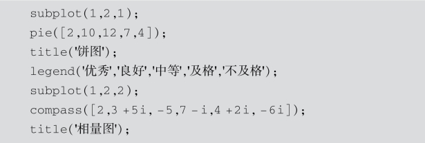 pie函数和compass函数分别绘制饼图和复数相量图.pie(x)绘制x中各元素的饼图,并给出各比例大小.compass(x,y)或compass(z)显示具有n个箭头的图像,每个箭头起点为原点,终点坐标由(x(i),y(i))或z(i)的实部和虚部给定,n为x或y或z的个数.详细的用法,读者可以查阅MATLAB中的帮助文件.