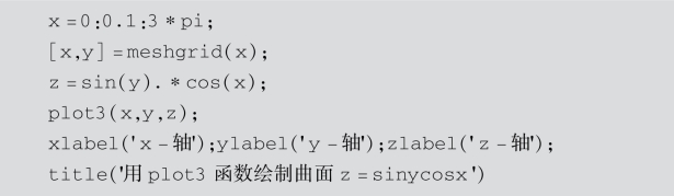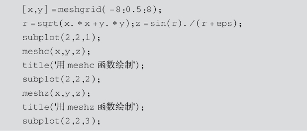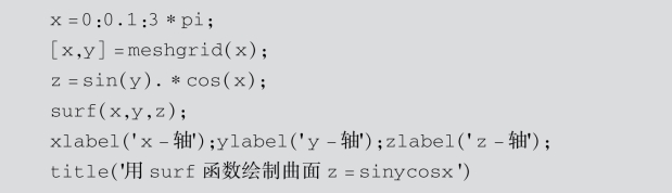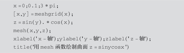 解:为了比较mesh函数、surf函数和plot3函数的区别,下面给出3个不同的程序,绘制出不同形式的曲面.