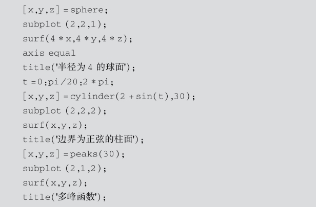 MATLAB还提供了一些特殊函数用来绘制标准的三维曲面.如sphere函数用来绘制三维球面,cylinder函数用来绘制柱面.peaks函数是多峰函数,常用于三维曲面的演示.多峰函数的数学表达式是: