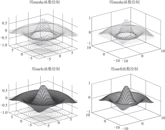 图3-23 分别用meshc函数、meshz函数、surfc函数和surfl函数绘制的图形