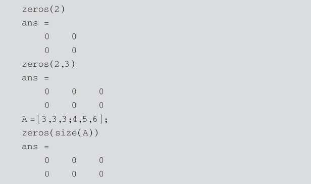 这几个函数的调用格式相似,下面以产生零矩阵的zeros函数为例进行说明.其调用格式: