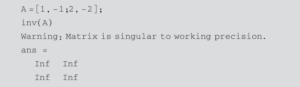 上述计算中可见A⋅B=B⋅A,即A⋅A-1=A-1⋅A,故A与A-1是互逆的.需要注意的是,对于严重病态的矩阵或奇异矩阵,inv求解时会出警告提示,因为这时候其逆矩阵本来就不存在,或者非常容易受扰动而使求解不精确,例如: