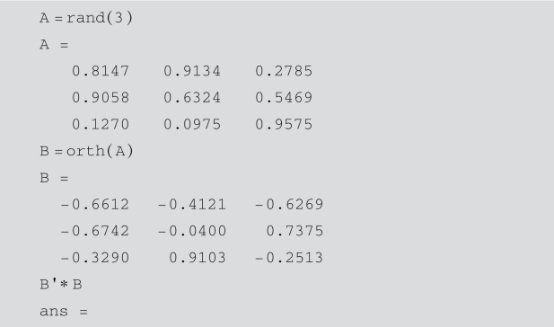 MATLAB中可以通过orth函数产生矩阵A的线性空间的一组标准正交基,即若B=orth(A),则B的列向量组成了矩阵A的线性空间的一组标准正交基,于是B′∗B=eye(rank(A)).
