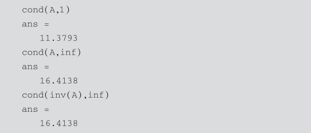 这样定义的条件数总是大于1的.条件数越接近于1,矩阵的性能越好;反之,矩阵的性能越差.按照前面定义的A的3种范数,相应地可定义3种条件数.在MATLAB中,计算A的3种条件数的函数是: