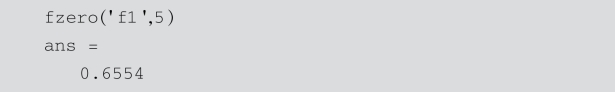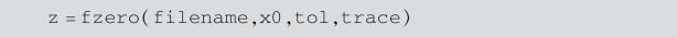 其中,filename是待求根的函数文件名;x0为搜索的起点,一个函数可能有多个根,但fzero函数只给出离x0最近的那个根;tol控制结果的相对精度,默认时取tol=eps;trace制定迭代信息是否在运算中显示,为1时显示,为0时不显示,默认时取trace=0.