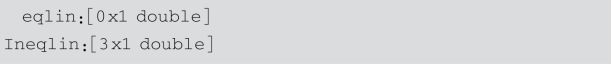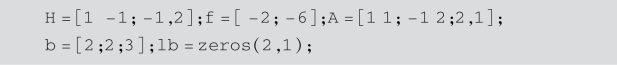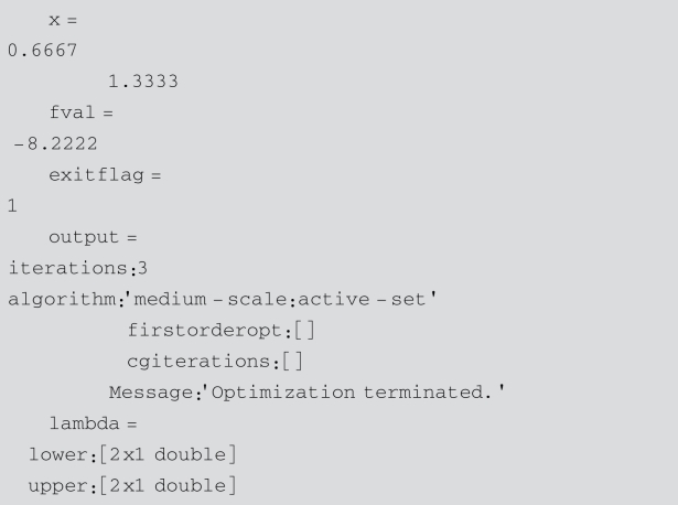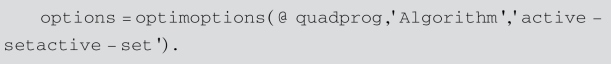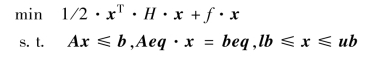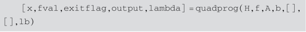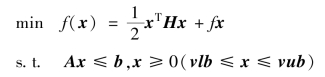 [x,fval,exitflag,output,lambda]=quadprog(H,f,A,b,Aeq,beq,lb,ub,x0,options):x0为迭代初值,返回exitflag参数,描述计算的退出条件.返回包含优化信息的结构输出output,返回解x处包含拉格朗日乘子的lambda结构参数.其中options表示优化参数,可选择3种算法之一:trust-region-reflective、interior-point-convex、active-setactive-set.options缺省时,默认算法trust-region-reflective,其他算法可通过optimset或optimoptions完成,如: