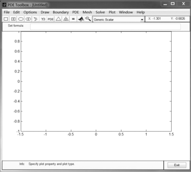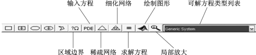 在MATLAB命令窗口中键入“pdetool”,打开“pdetool”窗口,即可使其进入工作状态,如图5-16所示.工具栏中的图形按钮功能如图5-17所示.下面以例题形式给出应用pdetool求解偏微分方程数值解的一般过程.