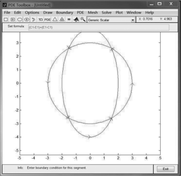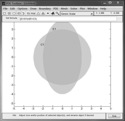 在本题中,首先绘制圆C1和椭圆E1,并修改其参数,使之符合题目中Ω1和Ω2的要求.然后通过在公式框中输入“(C1-E1)+(E1-C1)”,即可得到本题求解区域Ω,如图5-18所示.