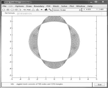 单击工具栏的第8个和第9个按钮,可以对求解区域进行三角剖分.多次单击精细网格按钮,可以在原来基础上多次细化网格.另外,可以通过“Mesh”菜单对网格进行精确控制.本题中,网格剖分后如图5-20所示.