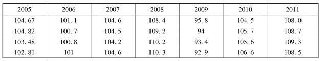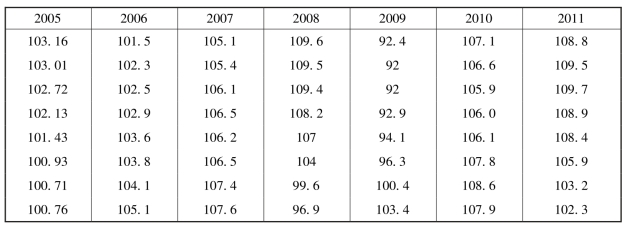 例6.2 中国人民银行公布的2005年1月至2011年12月的我国企业商品价格总指数见表6-1.