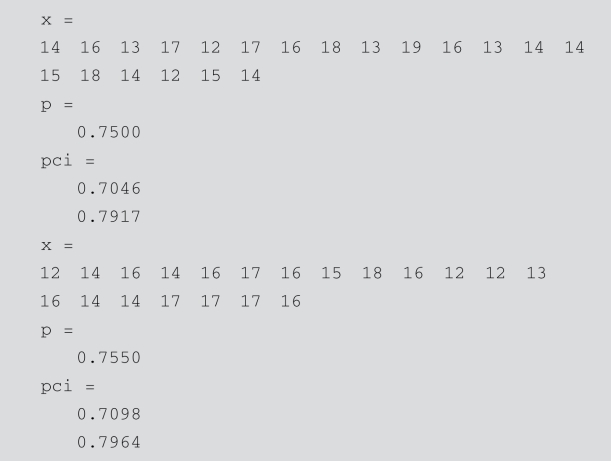 中用到的试验次数N仅用于二项分布.这里phat为‘dist’指定分布中参数p的极大似然估计;pci为参数p的1-alpha置信区间.