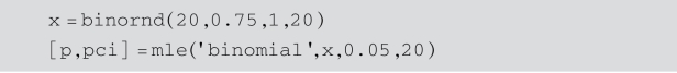 例6.7 产生服从二项分布B(20,0.75)的数据20次,利用mle函数求出该二项分布的极大似然估计和95%置信区间.