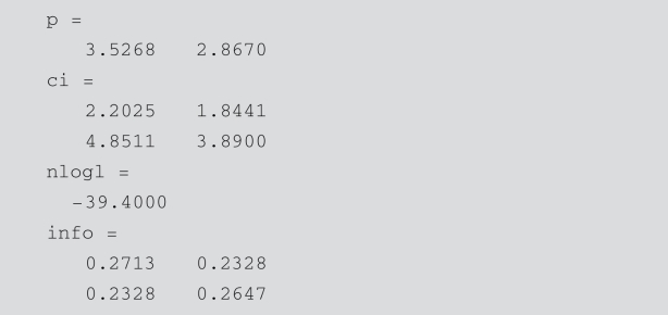 其中,params是二维参数向量;x是数据.如果输入参数params是极大似然估计值,返回值nlogl是对数似然负函数,info为费歇尔信息阵,其主对角线上的元素为各参数的渐近方差.