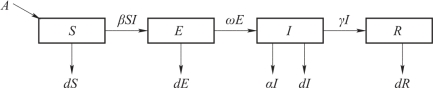 其中,总人口N(t)=S(t)+E(t)+I(t)+R(t);A表示人口的常数输入数目,即单位时间内输入的人口总数,本章认为都是易感者;为潜伏期;d代表自然死亡率系数;γ表示感染者的恢复率系数;α表示因流感而死亡的死亡率系数.