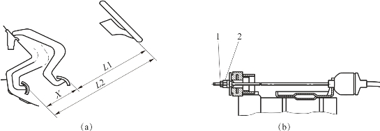 离合器踏板行程X的调整:如果数值不正确或踏板过高,拧松锁紧螺母1。按需要,拧紧或拧松调整螺母2,以便将行程调整至规定值。最后,拧紧锁紧螺母1,力矩为6N·m。拧紧螺母是增加行程,拧松则是减少行程。