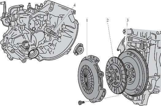 如图1-26所示,拆下离合器1、离合器从动盘2和离合器止推轴承(参看知识准备)。