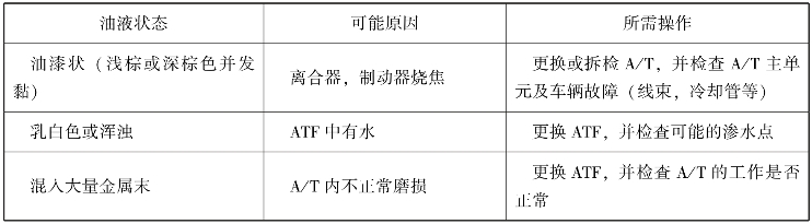 请参阅自动变速器维护液位检查相关项目。油液状态分析如表3-2所示。