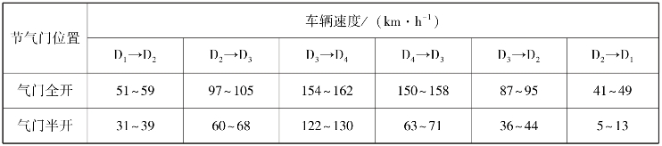 ③检查A/T从D1换到D2、从D2换到D3、从D3换到D4时的车速,检查各换挡点车速是否符合厂家规定的速度范围,如表3-6所示。