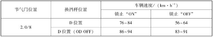 ②当锁止占空比达到94%时,读取车速、节气门位置,检查特定速度时是否会锁止。检查发生锁止时的车速是否符合厂家规定的速度范围,如表3-7所示。
