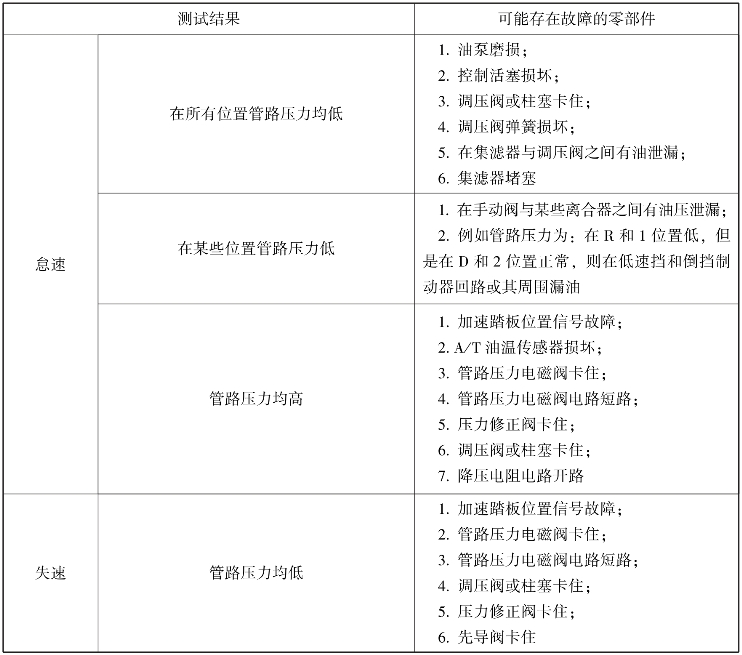 (2)常规检查。开始诊断前,应进行常规检查,主要项目包括基础检查(参阅自动变速器维护中所列项目)、车辆移动检查、失速检查、油压检查等。