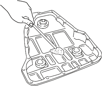 检查油底壳中的异物,如图3-23所示,以便确定故障的原因。如果ATF极黑、有焦煳味或含有异物颗粒,可能需要更换摩擦材料(离合器、制动带)。如果有不易擦净的黏稠油膜则说明形成了漆质膜。漆质膜会引起阀、伺服缸和离合器卡死并会降低油泵的压力。如果发现有脱落的摩擦材料,修理自动变速器后更换散热器。