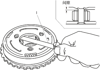 (6)检查小齿轮垫圈与行星齿轮架之间的间隙,利用塞尺测量,如图3-29所示,如果间隙的值超过极限值,更换行星齿轮架。