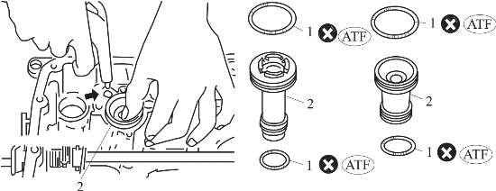 (2)检查每个蓄压器活塞与变速器壳的滑动表面,蓄压器活塞如图3-25所示,如果出现损坏或凹坑,则进行更换。检查蓄压器回位弹簧,如果变形、磨损或自由长度与工作长度不符合要求,则进行更换。O形密封圈每次解体后都要更换,装配时用ATF润滑。